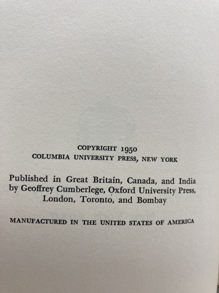 Columbia University Press First Edition 1950. Hardcover book and dust jacket in very good condition. Binding is square and tight. Pages are clean with no writing or highlights. Navy blue color on top of textblock is faded near spine. Dust jacket has a few small tears along edges.